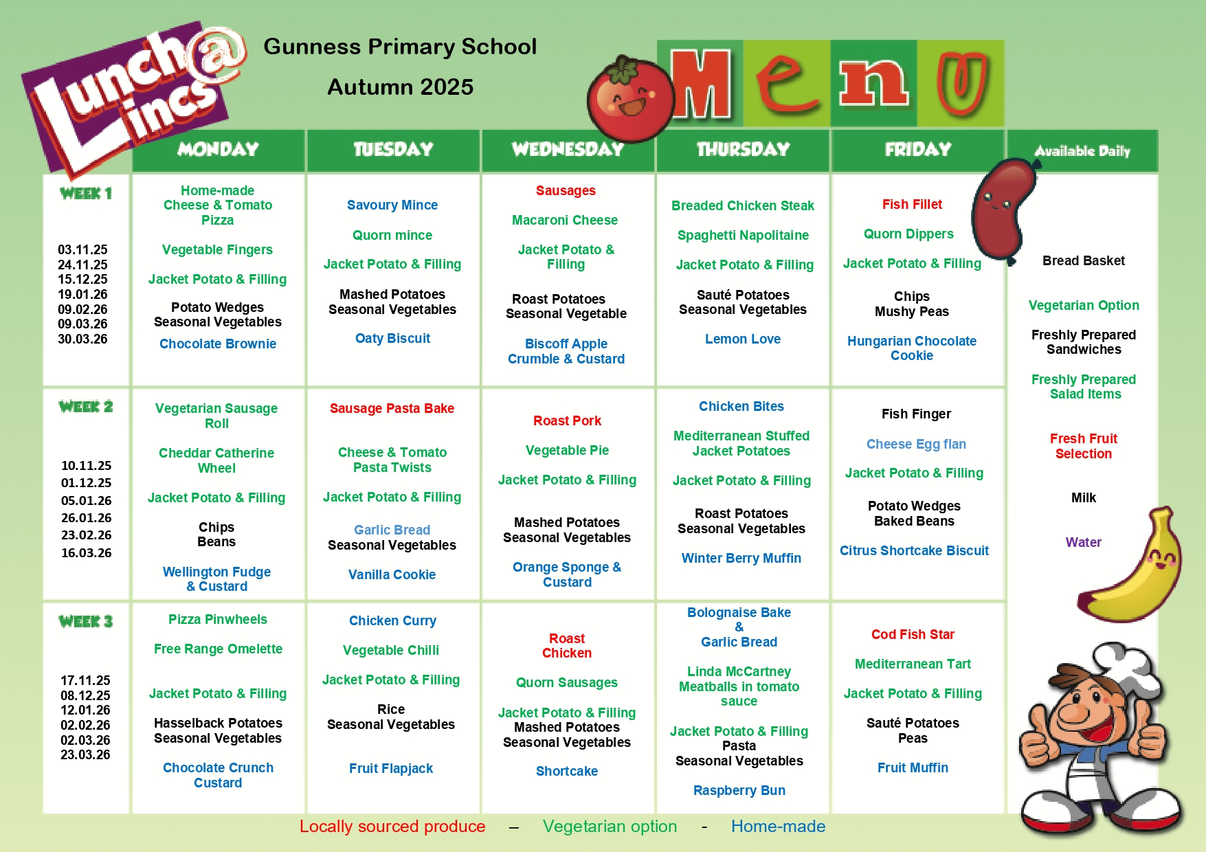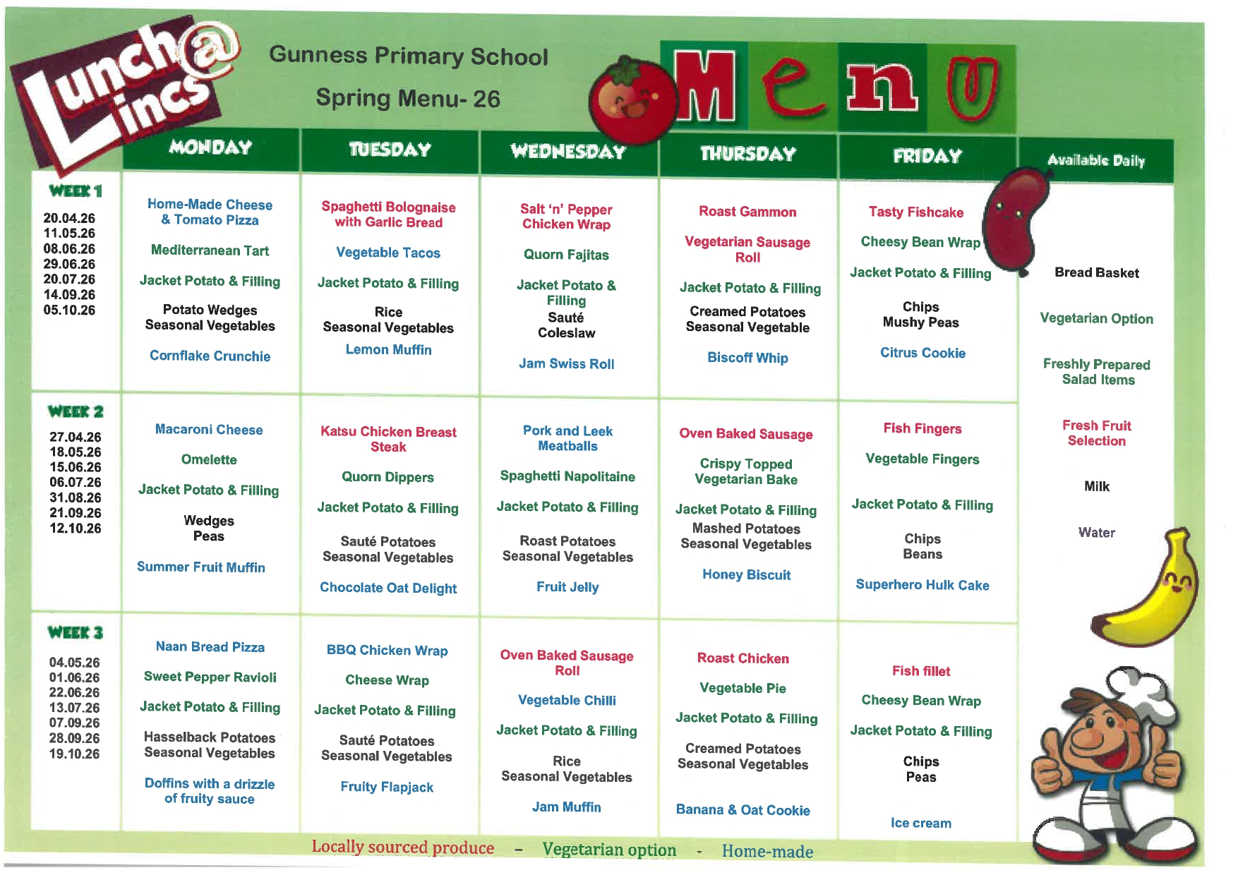 Children have the opportunity to choose a school lunch or bring a packed lunch from home. We are a healthy school and so we actively encourage a healthy lunch and ask that fizzy drinks or cans are not packed in lunch boxes. We also kindly request that any snacks brought into school for morning break are fruit, vegetable or cereal bars only. Supplies of fruit are readily available for all children in the corridor to help themselves to. Children who stay for a hot school lunch have the choice from two hot meals or alternatively have the choice of sandwiches or jacket potatoes – these are available daily.